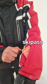 Marca AST, ha una tasca elastica per il telefono, una per gli occhiali, due frontali e una sulla manica per lo skipass. il cappuccio è staccabile con una zip.