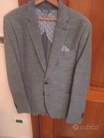 Giacca da uomo TG 50 a fantasia su fondo blu con motivi bianchi fodera solo nella parte davanti