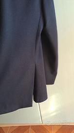 Giacca da uomo in panno liscio di lana, colore blu; taglio sportivo, diritto, spacchi laterali sul dietro, bottoni dorati sul davanti e sui polsi e fodera interna. Ottima versabilità. Taglia 50