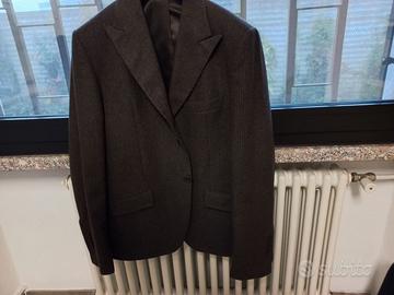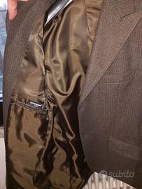 Vendo, per inutilizzo, giacca da uomo tipo gessato di colore marrone con sottili righe bianche taglia 50. Fresco di lana, interamente foderata all'interno con due tasche laterali e taschino