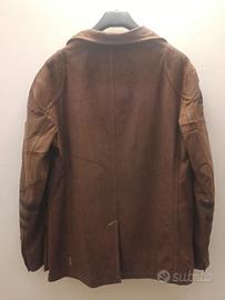 Giacca uomo scamosciata colore marrone Armani jeans, caratterizzata dalla fodera interna a fantasia tigrata giallo e nero con diverse tasche frontali.