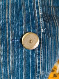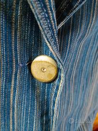 Giacca di jeans leggera a righe sottili. Tasche e bottone con strass. Si abbina molto bene a un jeans o a un pantalone bianco. Presenta qualche filo come in foto. Taglia non indicata ma veste circa una xs/S.