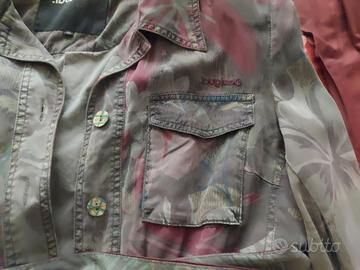 Giacca tipo sahariana che combina una stampa camouflage con motivi floreali, quattro tasche sul davanti e cintura in vita coordinata ma staccata, chiusura con bottoni colorati, foderata e con spalline. Taglia 46 comodo.