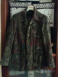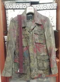 Giacca Desigual tipo sahariana con stampe floreale e camouflage, dotata di quattro tasche frontali e una cintura staccata foderata. Taglia 46