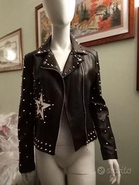 Bellissima e originale giacca di similpelle con borchie, decorazioni e ricami: borchie su tutto il perimetro di colletto, giacca e maniche, due stelle di ecopelle davanti e un bellissimo ricamo in filo di cotone sulla schiena.