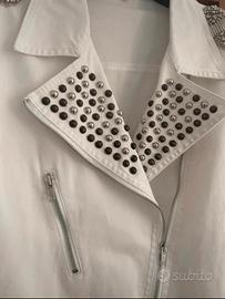 Giacca di jeans bianca, con applicazioni gioiello in metallo argentato su spalle e davanti.