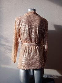 Blazer nuovi con etichetta. Giacca di paillettes con doppia fodera interna. Spalle 37cm , lunga 70cm . Made in Italy. Cintura abbinata. Presenti i passanti.