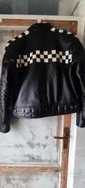 Giacca nera da motociclista in vera pelle, motivo checkerboard con inserti in pelle bianca. Made in USA, del marchio Texas Leather USA, taglia 42, veste S. Come nuova, indossata pochissimo.