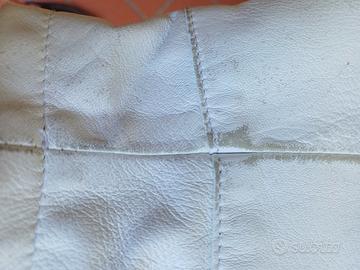 Giacca tipo motociclista in vera pelle con tasche laterali con lampo e cinturini in vita. Lievi segni di usura nelle maniche.