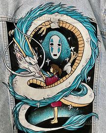 Giacca jeans dipinta a mano con colori per tessuto con soggetto la citta incantata di Hayao Miyazaki. Taglia 46.