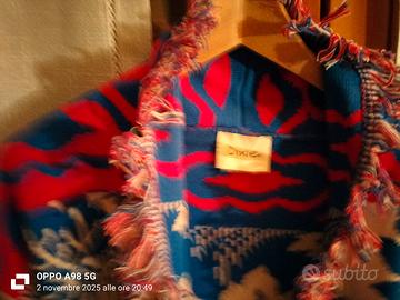 Vendo giacca 100% cotone collezione Dixie multicolori con cintura blu attorno alla vita e frange nella parte finale del capo e del collo. Taglia S e capo per donna.