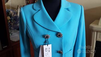 La giacca è impreziosita da bottoni gioiello, la linea è avvitata ma confortevole.