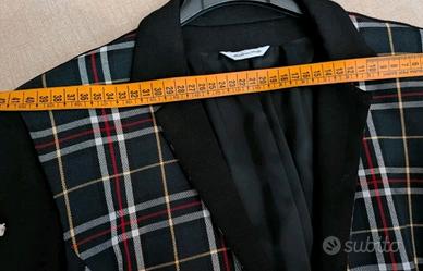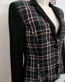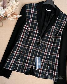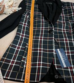 Giacca donna elegante con fantasia tartan su base scura e maniche nere lisce.