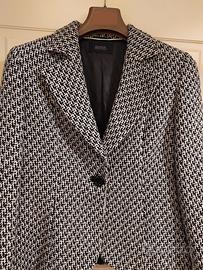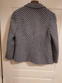 Giacca glamour da donna in lana e cotone color bianca e nera il modello di tendenza senza tasche con la chiusura mono bottone internamente rivestita in fodera in acetato e viscosa color nero taglia 42. gid025. Lunghezza 62 cm. larghezza spalla 42 cm. larghezza torace 52 cm. Usata in eccellenti condizioni originale ed autentica. Diana Gallesi - Made in Italy