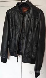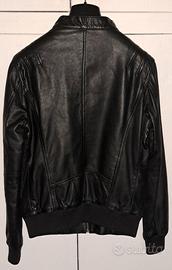 Biker in pelle nera, fodera interna, collo alla coreana, taglia 42 IT. Misure: lunghezza 61 cm, spalle 38 cm, petto 49 cm, manica 62 cm.