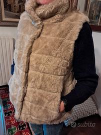 giacca in pelo ecologico color beige smanicata, ottima da indossare anche con maglione pesante in inverno o più avanti con ciò che si vuole. indossa perfettamente é foderata, si chiude con gancetti che non restano in visione dotata di tasche laterali. lunghezza da spalla cm 61 larghezza seno cm50