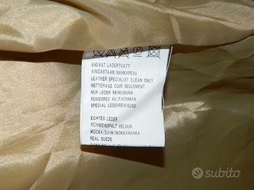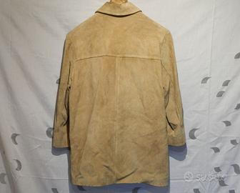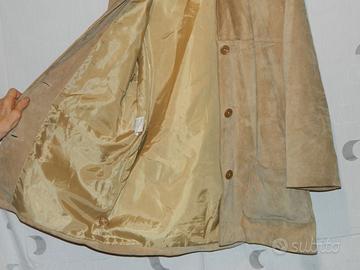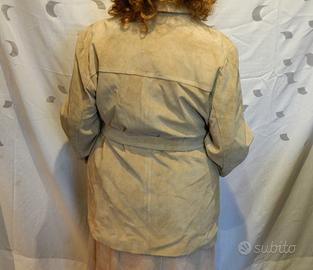 Giacca camicia da donna in pelle suede, taglia 54, colore oro perlato, due tasche esterne, cintura in tinta, fodera in poliammide. Condizioni ottime.