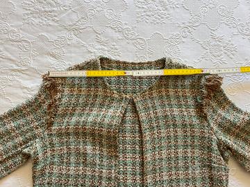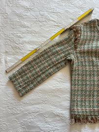 Elegante giacca in tweed intrecciato, realizzata con una combinazione di filati in verde salvia, beige, marrone e crema, che dona profondità e una texture raffinata. Il tessuto è morbido ma strutturato, ideale per la mezza stagione o da indossare come capo elegante sopra camicie e maglie leggere.