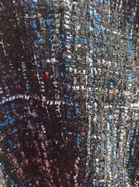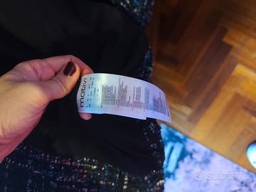 Giacca donna Motivi perfetta, come uscita dal negozio. Lo sfondo è nero con decorazioni a righe incrociate azzurre e color ghiaccio. La giacca è impreziosita da eleganti bottoni quadrati. Materiale poliestere. Taglia 42. Misure: lunghezza 47,5 cm, spalle 42 cm, ascella a ascella 48 cm.