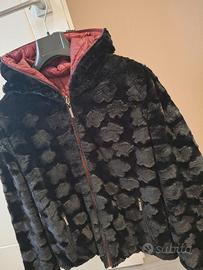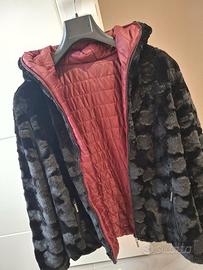 La giacca è reversibile da una parte è effetto pelo maculato a rilievo, mentre dall' altra è piumino di colore amaranto.
