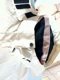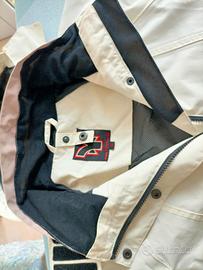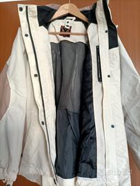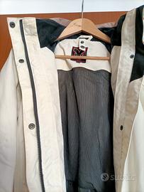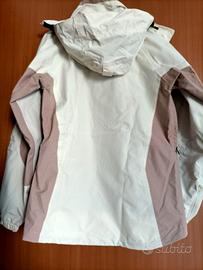 Giacca da escursionismo per donna. Bicolore panna e beige chiaro, con cappuccio e multitasche interne e esterne. Taglia 36, small, in nylon.