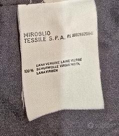 La giacca è foderata e presenta due tasche sul davanti, collo a revers e abbottonatura con due bottoni di madreperla piatti in tinta con il fondo giacca.