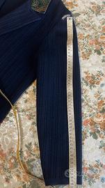 Collo e bordo delle tasche in velluto fantasia. Bottoni decorativi in metallo con stemma.