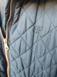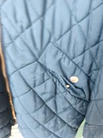 bellissima giacca donna blu imbottita ma leggera e morbida, trapuntata, con cappuccio. tasche con bottone e chiusura zip. taglia 50 (da spalla a fondo circa 82)