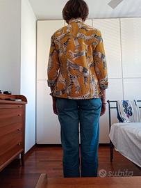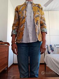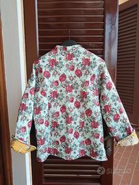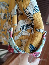 Giacca indiana da donna reversibile e trapuntata leggermente imbottita in cotone colorato colori sgargianti indiani con stampa sui toni del giallo e del bianco fantasia tigre gatti gattoni felini da un lato reversibile altro lato è sui toni dell'azzurro chiaro celeste blu e del rosso rosa viola purple motivo a fiori floreale, cappotto in sari di cotone, giacca corta