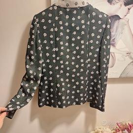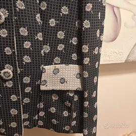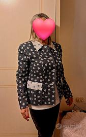 Tessuto principale con fantasia a quadretti e margherite, dettagli su colletto e tasche con effettolaminato(brillantinato/paillettes)