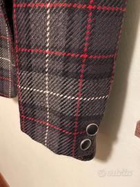 Giacca donna scozzese vintage,di colore grigio con profili di riquadri bianchi e rossi.
