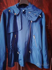 Giacca donna di colore azzurro-blu, con cappuccio. 2 Tasche chiuse da cerniera, elastico regolabile in vita. Chiusura con cerniera obliqua. Interno foderata. Leggera adatta alle sere fresche. Usata poche volte. Ottimo stato.