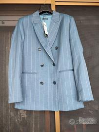 Vendo giacca doppiopetto da donna Sisley nuova con cartellino costava 159,00 euro, taglia 44 regolare spalle 46 cm petto 51 cm, lunghezza 67 cm. Tessuto con lino , viscosa sostenibile ( eco blend) e cotone come da foto.