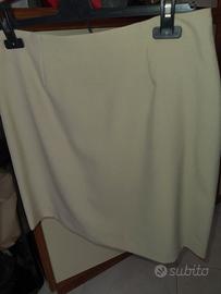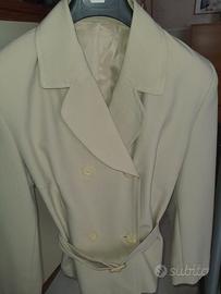 Completo beige di gabardine. TG. 48 Completo si compone di una giacca con lunghezza sui fianchi, collo con risvolti ampi e abbottonatura a doppio petto. E' impreziosita da una cintura dello stesso colore che la rende più elegante. E' interamente foderata, ha un'ottima vestibilità e morbidezza del tessuto. Gonna a tubino dello stesso colore e tessuto. Foderata e rifinita da cerniera e bottone.