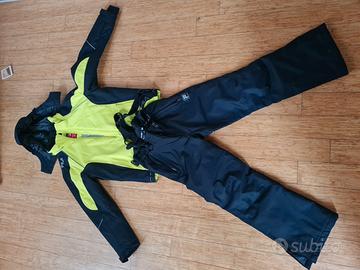 Giacca e pantaloni della FILA per sport invernali sci ecc. anni 12 , Giacca con polsini cappuccio ed è inoltre dotata di gonna da neve che chiude la giacca in vita con elastico, pantaloni complete di bretelle elastiche e ghette interne con elastico su scarponi alti.