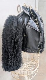 Giacca stile "Biker" (chiodo) in morbida ecopelle nera, caratterizzata da scenografiche maniche interamente lavorate a ruches in tulle. Un capo unico, perfetto per rendere speciale anche l'outfit più semplice.