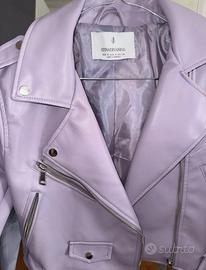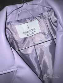 Giacca effetto pelle donna colore lilla con collo a revers e maniche lunghe. Tasche anteriori con zip metallica. Applicazione di cintura dello stesso tessuto con fibbia.