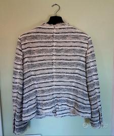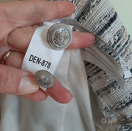 Il tessuto è a trama irregolare tipo tweed e ricorda le stoffe di C.hanel, colori sui toni del panna, sabbia e blu. Sta bene sia su un outfit elegante che casual sui jeans.