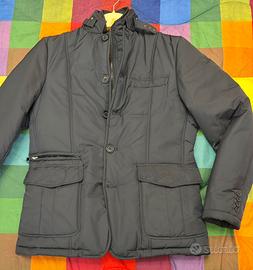 Giacca dal design elegante imbottita. Colore blu . Come da foto ha un aspetto elegante e tiene caldo anche nelle giornate fredde. Pettorina antifreddo con cerniera asportabile. Bottoni sulla manica e taschino stile giacca. Ottime contizioni . Misura M. Nella foto io sono alto 1,75 e peso 67