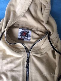 giacca in cotone non felpato marca "Freddy la danza" full zip, cappuccio, logo grande sul retro, tasca sulla manica, taglia M ma veste più ampio fino a L perchè taglio dritto stile Funky wear vintage, unisex, usata poche volte, perfetta, senza difetti