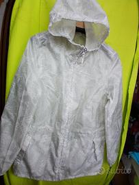 Leggerissima giacca da trekking impermeabile e antivento da donna Quechua Raincut Full Zip , in perfette condizioni sfondo bianco con disegni di foglie grigio chiaro. Chiusura lampo anteprima a tutta lunghezza, tasche laterali e polzini con elastico. All'altezza della vita è presente una cordicella interna dove si può