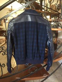 giacca blu in pelle e lana cotta a scacchi blu e nero, TG 40. Marca Gianfranco Ferré usata ma in ottime condizioni e senza segni di usura , modello corto in vita con fascia elastica blu.