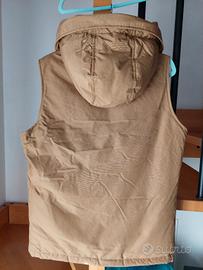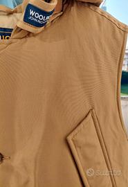 Giacca gilet / smanicato / senza maniche, marca Woolrich, colore beige caldo (vedere ultima foto, scattata all'aperto). Usato poche volte e senza nessun segno di usura, le pieghe dietro sono dovute all'averlo messo via piegato in una borsa da cambio armadio, vanno via tenendolo appeso.