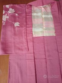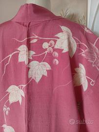 Haori giapponese in seta rosa (il colore reale è più chiaro) con decorazione bianco edera e bacche, dalla spalla destra scende sulla schiena e braccio destro. Cucito a mano e realizzato in pregiata seta hige tsumugi che tradotto è seta pelosa, infatti i nodini fatti per unire gli spezzoni di filo di seta restano fuori dalla trama in alcuni punti. Aloni di conservazione nella fodera interna. Ottime condizioni. Per conservare questo capo è stato utilizzato un prodotto antitarme e l'odore si può percepire.