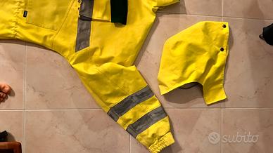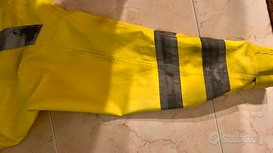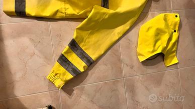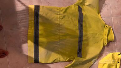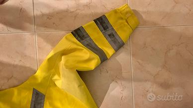 Vendo giacca impermeabile alta visibilità di colore giallo fluorescente, con bande riflettenti grigie anteriori e posteriori.