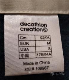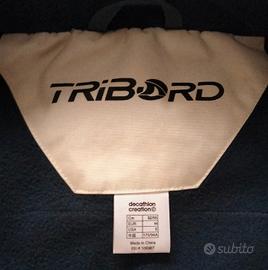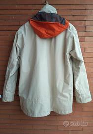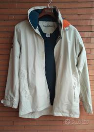 Giacca colore panna, impermeabile, con cappuccio arancione a scomparsa nel colletto, foderata con pile colore blu, marca Tribord di Decathlon, taglia M (buona vestibilità), come nuova.