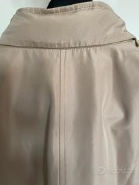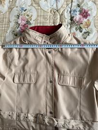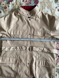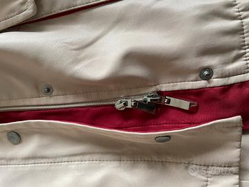 Giacca impermeabile YIMEI tg XXL colore beige con profili rosdo borgogna, tessuto poliestere, interno foderato, con chiusura zip (doppio cursore perfettamente funzionante) e bottoni a pressione, dotata di cappuccio celata da cerniera sul collo. E’ indicata tg XXL, comunque per chiarezza riporto le dimensioni: Spalle cm 45 Da ascella ad ascella cm 54 Lunghezza cm 70 Ottime condizioni, nessun segno di usura, il prezzo proposto sconta il fatto che a mio avviso la fibbia della cintura va sostituita, c’è un solo gancetto e non comprendo come si possa chiudere.