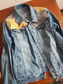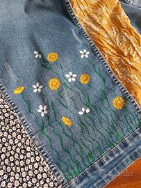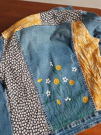 Taglia: S Giacca in denim con fiori dipinti a mano ad acrilico e ritagli cuciti a mano
