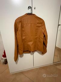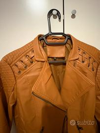 Giacca in ecopelle da donna color cuoio, in stile biker, zip diagonali e dettagli decorativi con lacci e impunture sulle spalle e sulle maniche.
