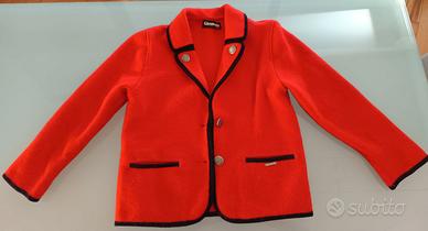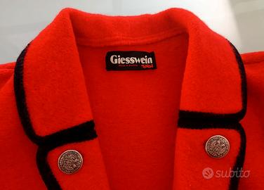 Giacca in lana cotta tirolese vintage degli anni 80, rossa con bordini neri. cura dei bottoni (uno di scorta all'interno). Marca Giesswein, made in Austria. Taglia 38 tedesca, taglia 42 italiana, veste M/L. Spalle con taglio basso, due taschine, maniche risvoltabili e da portare un filino corte. In perfette condizioni, usata tanto tempo fa e da parecchio al sicuro in un armadio.